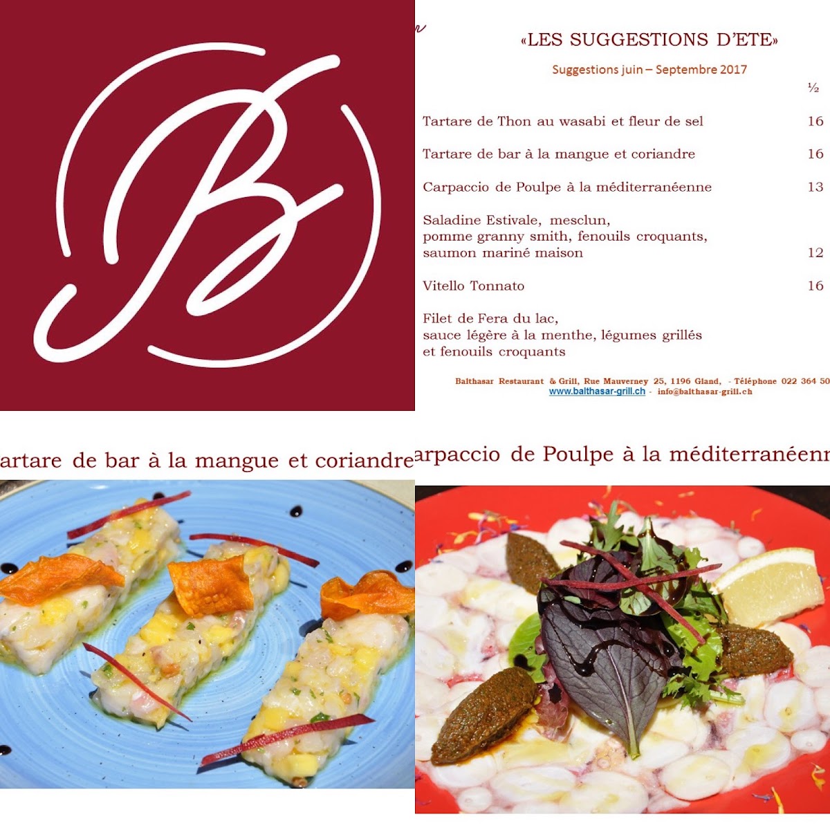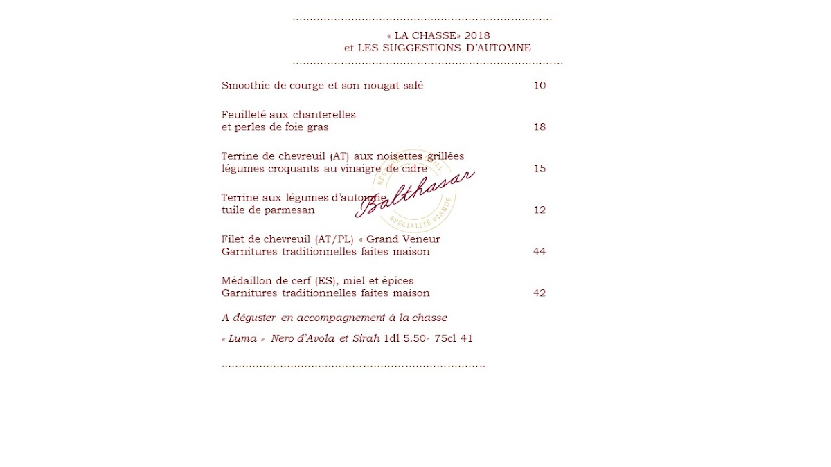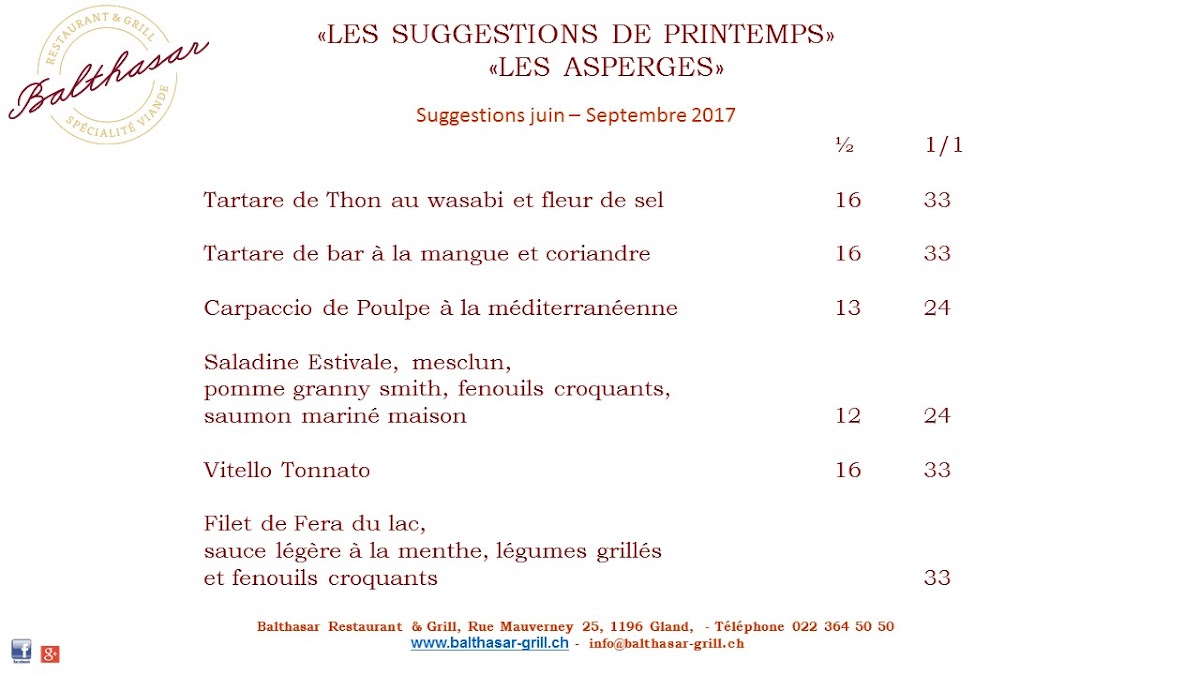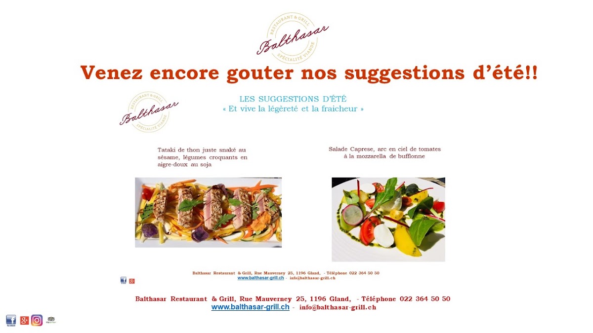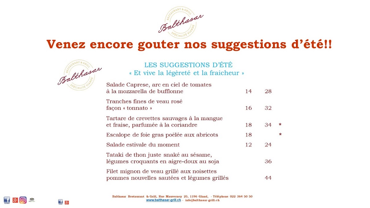 Welcome to Balthasar Restaurant & Grill, a culinary gem nestled in the heart of Gland, Switzerland. This elegant establishment offers a delightful menu centered around expertly grilled meats, complemented by a selection of thoughtfully curated starters and a fine array of wines. Guests rave about the delicious food, with highlights like their perfectly cooked steak, making it a popular choice for both locals and visitors alike.